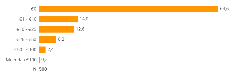 Meer dan de helft van de Nederlanders (64,6%) geeft helemaal niets uit aan Halloween. Uit het onderzoek blijkt echter dat ruim een derde van de Nederlanders wel degelijk geld uitgeeft aan artikelen voor Halloween, zoals decoratie en kostuums. Zo besteedt 14% van de ondervraagden tot €10,- en geeft 12,6% tussen de €10,- en €25,- uit. Een kleinere groep, ongeveer 6%, besteedt tussen de €25,- en €50,- aan halloweenbenodigdheden, terwijl 2,4% zelfs meer dan €50,- uitgeeft. Deze cijfers laten zien dat er een duidelijke groep is die écht investeert in Halloween, terwijl de meerderheid het feest juist op een meer bescheiden manier viert.